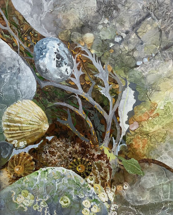 Rita studied printed textile design and fine print at Manchester Polytechnic, followed by many years as an art tutor. Her current paintings, mainly in acrylic inks on a highly textured or collaged ground, are developed from observational drawings, colour studies and location photographs. The natural environment provides the main source of inspiration, from walking in the local woodlands, to rockpools at the coast or the mudbanks of the River Severn.